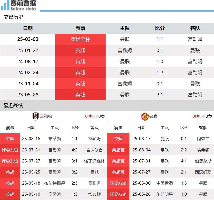 综上所述,此役看好曼联反客为主,客场拿下富勒姆取得首胜!